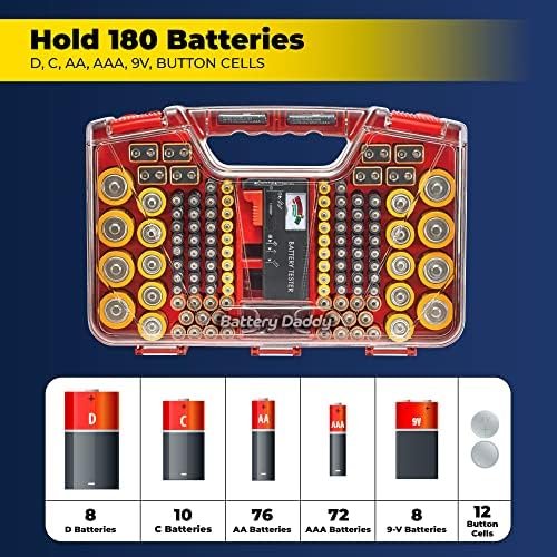 It fits up to 180 batteries, including a wide variety of types such as AA, AAA, C, D, 9V, and coin cells. It’s also compatible with most standard household batteries and their rechargeable variants. - Is the battery tester accurate and does it work on all sizes?