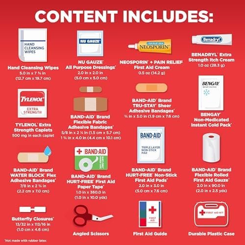 The All-Purpose Portable Compact First Aid Kit from the Band-Aid Store is a must-have 160-piece emergency kit, perfect for home, car, travel, and outdoor adventures. This comprehensive kit features trusted BAND-AID Brand bandages, wound care essentials, full-size Neosporin antibiotic and Benadryl itch relief creams, Tylenol pain reliever, and more, all neatly organized in a durable case. HSA & FSA eligible, it ensures you're always prepared for minor cuts, scrapes, sprains, and burns—making it an essential addition to any safety plan. Be ready for emergencies anywhere with this dependable first aid solution.