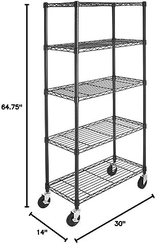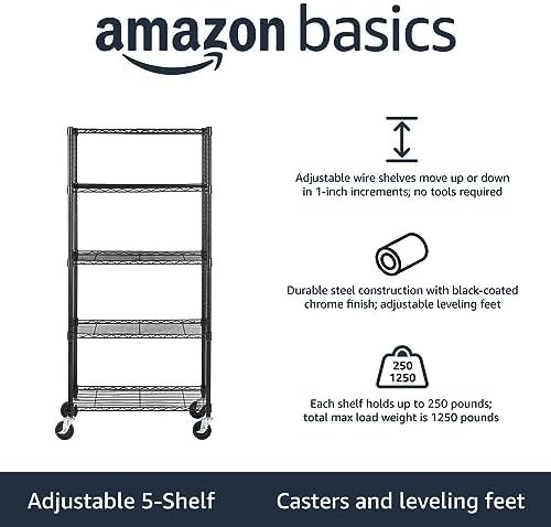 The Amazon Basics 5-Shelf Heavy Duty Garage Shelving Storage Rack is a versatile metal wire organizer perfect for maximizing storage in your garage, laundry, kitchen, or workspace. With adjustable shelves and a robust steel frame, it supports up to 300 lbs per shelf and offers easy maneuverability thanks to 4-inch caster wheels. This shelving unit assembles effortlessly with no tools required, making organization both simple and efficient. Durable, spacious, and reliable, it’s an excellent choice for anyone seeking heavy-duty storage with flexibility.