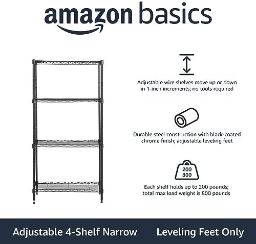 The Amazon Basics 4-Shelf Steel Wire Storage Shelves are a sturdy and versatile solution for organizing your space, supporting up to 200 lbs per shelf and offering a total 800-pound capacity. With adjustable shelves, easy no-tool assembly, and durable black steel construction, this shelving unit adapts perfectly to garages, kitchens, laundry rooms, or playrooms. Enjoy reliable, customizable storage from the trusted Amazon Basics brand—ideal for decluttering and maximizing any area.