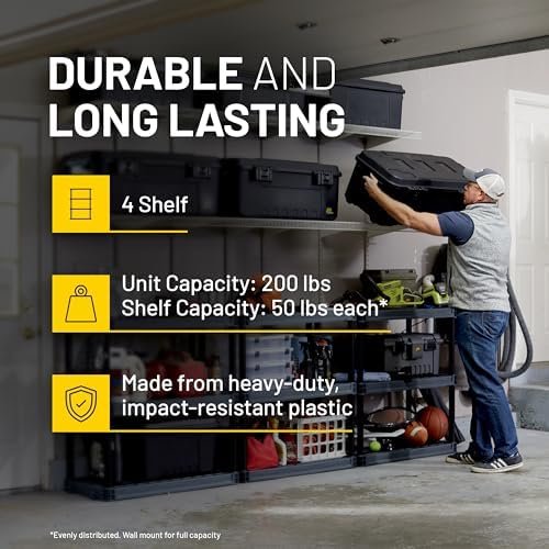The Plano 4-Shelf Plastic Storage Shelves offer a sturdy and versatile storage solution for your pantry, office, closet, or garage. With a durable, impact-resistant plastic build and a 200lb total capacity, each shelf holds up to 50lbs for maximum organization. Easy to assemble without tools and featuring an interlocking design, these Made-in-USA shelves are perfect for expanding your storage space quickly and efficiently. Choose Plano for reliable, heavy-duty shelving that keeps your space neat and clutter-free.