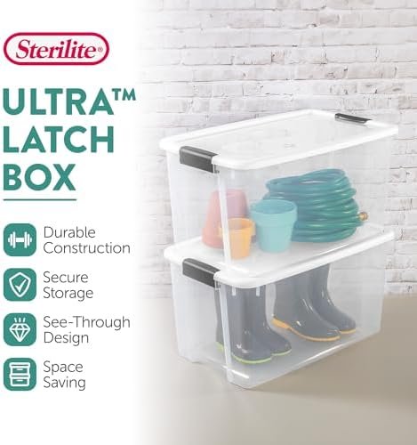 The Sterilite 4 Pack Ultra Latching Box offers an ideal storage solution with heavy-duty, secure latches and a transparent design for easy item identification. These spacious 70-quart bins are perfect for organizing closets, bathrooms, or offices, and their stackable construction maximizes vertical space. Proudly made in the USA, Sterilite ensures its BPA- and phthalate-free containers are both durable and safe, making them a reliable choice for any home or office organizer.
