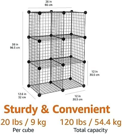 The Amazon Basics 6-Cube Wire Grid Stackable Storage Organizer is a versatile shelving unit perfect for organizing linens, toys, books, shoes, and more. Featuring six durable, interlocking cubes made of black powder-coated steel wire, this modular system is easy to assemble without tools and supports up to 20 pounds per cube. Its expandable, customizable design makes it ideal for any room, offering both convenience and sturdy storage from a trusted brand. Upgrade your organization effortlessly with this functional and stylish Amazon Basics solution.
